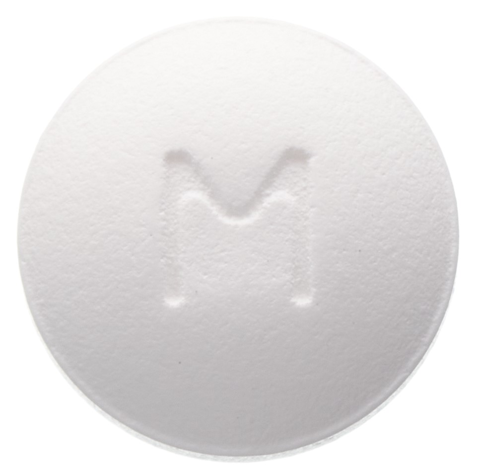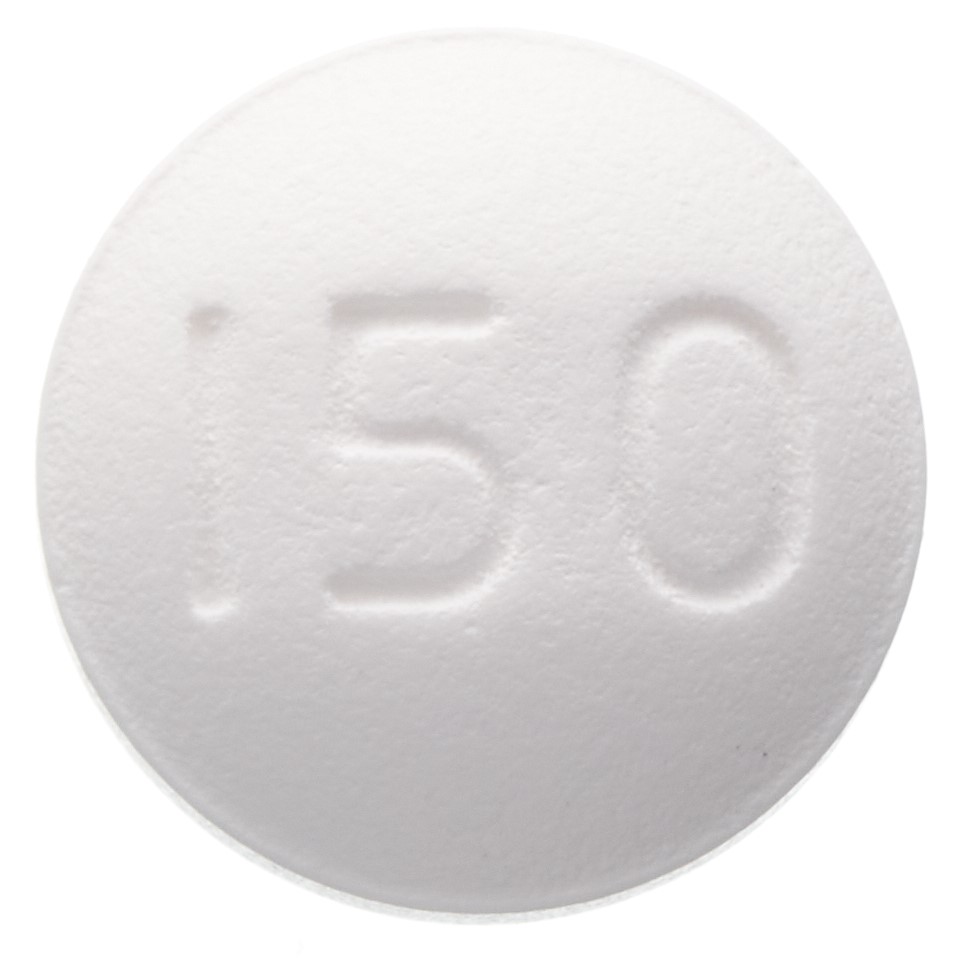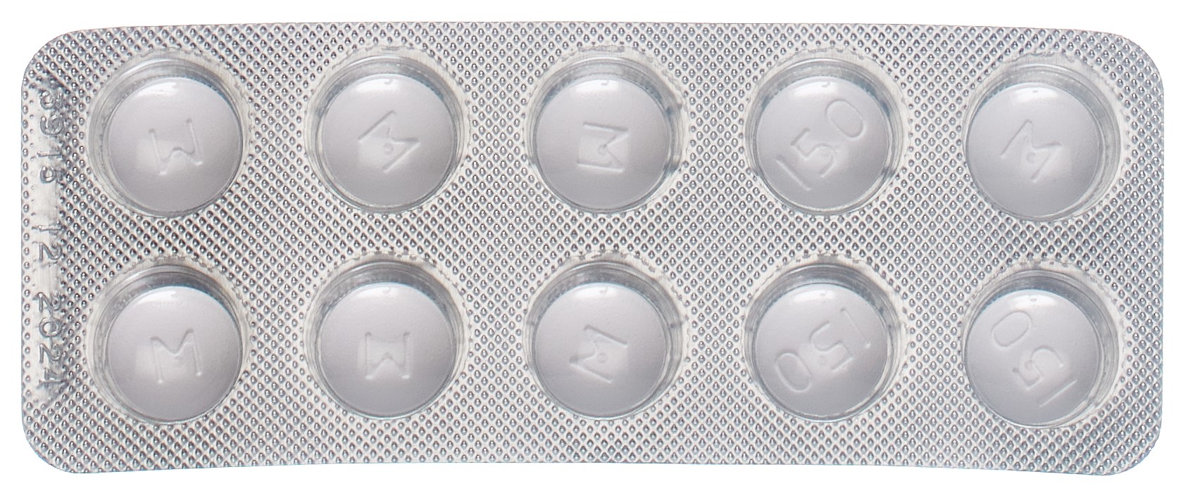 Filmtabletten, rund, grau/weiss, Prägung: Vorderseite M; Rückseite 150